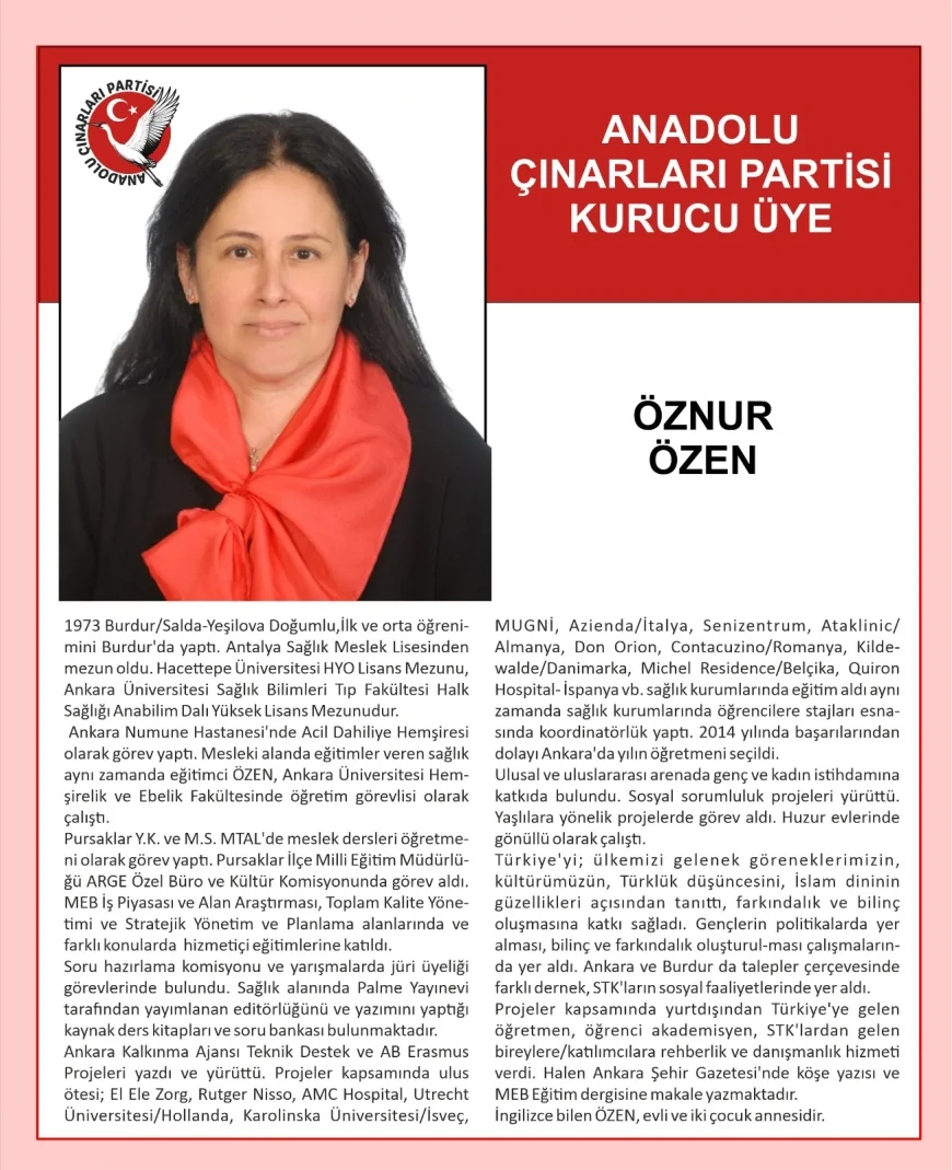 Sağlık ve eğitim alanlarında edindiği mesleki deneyimi siyasal alana taşıyan Öznur Turan Özen, uzun yıllara yayılan kamu hizmeti geçmişiyle dikkat çekiyor. Halk sağlığı, eğitim politikaları ve sosyal kalkınma alanlarındaki çalışmalarıyla bilinen Özen, aktif siyasi yaşamını Anadolu Çınarları Partisi bünyesinde sürdürüyor.